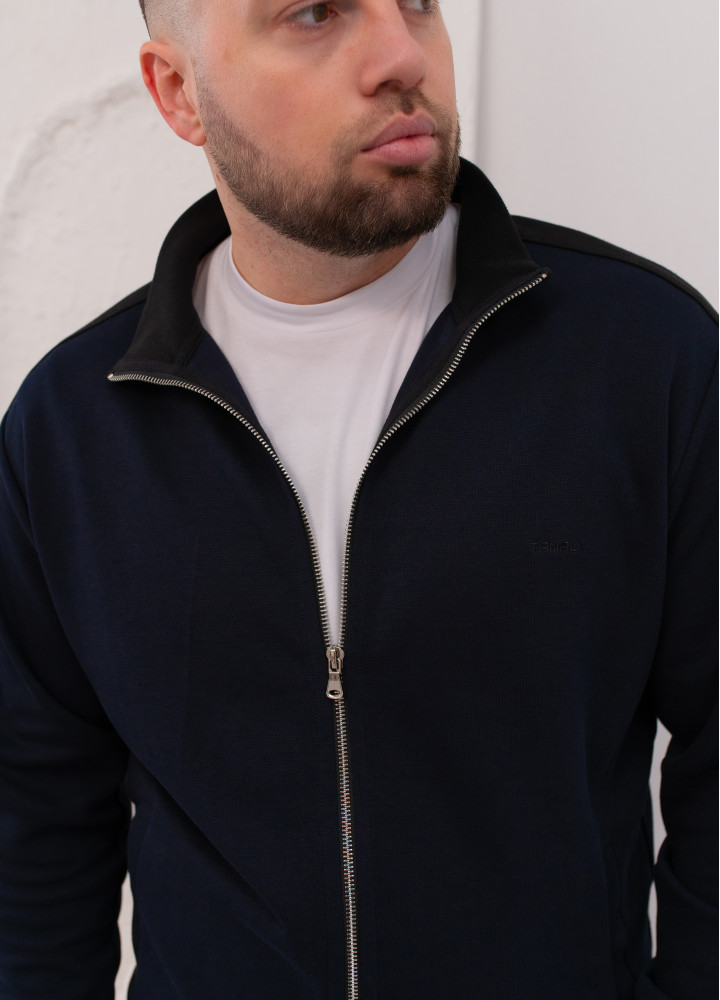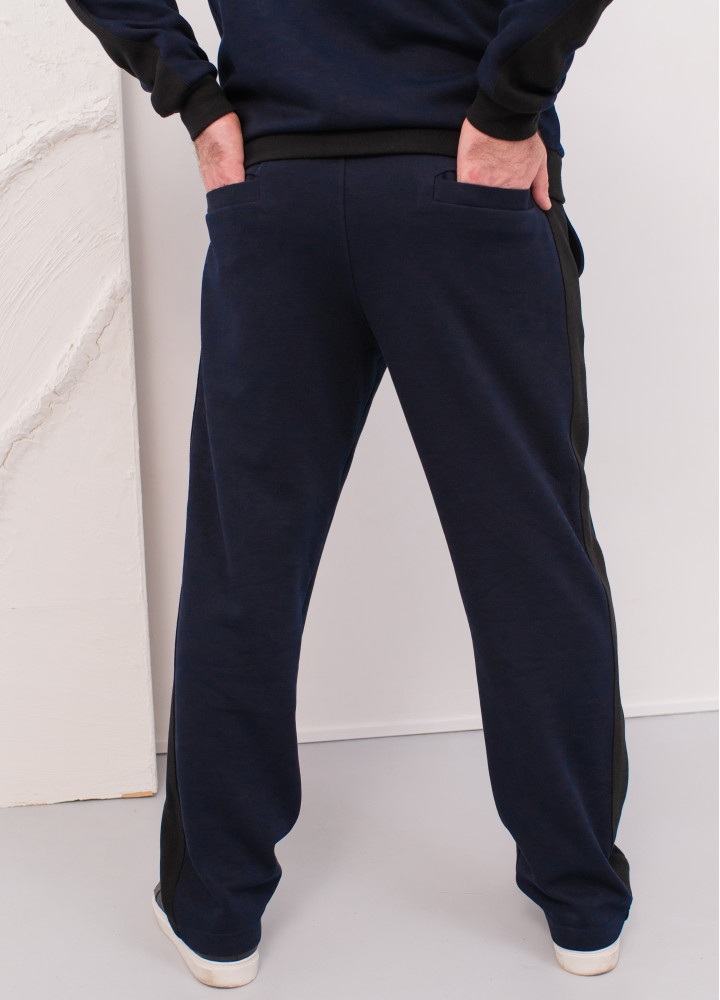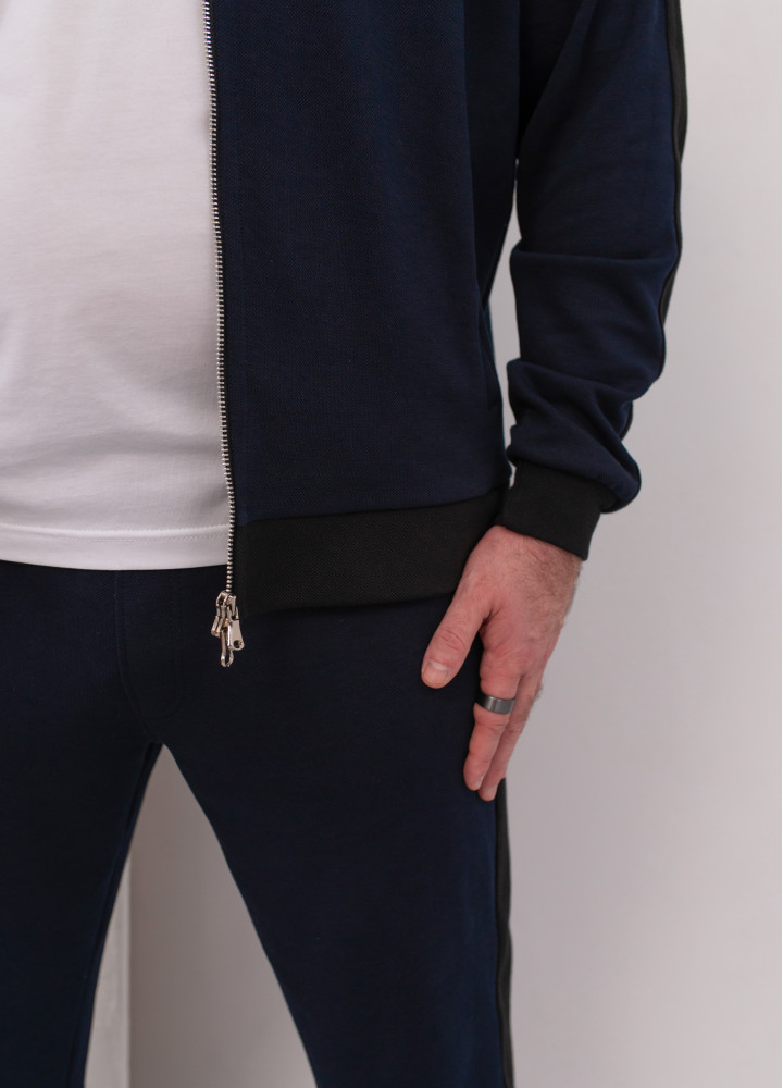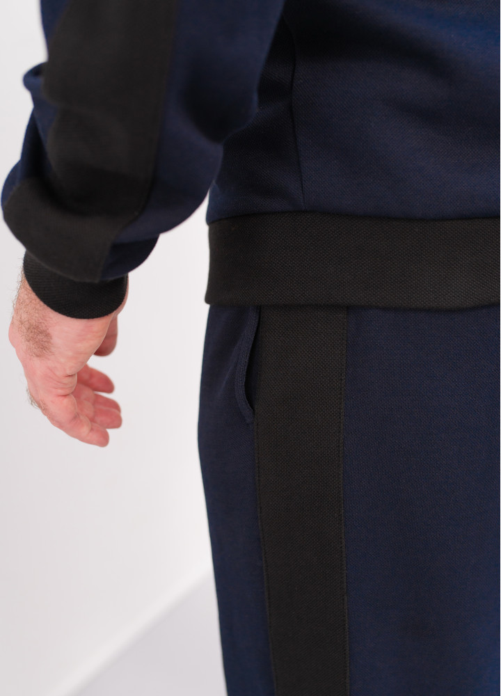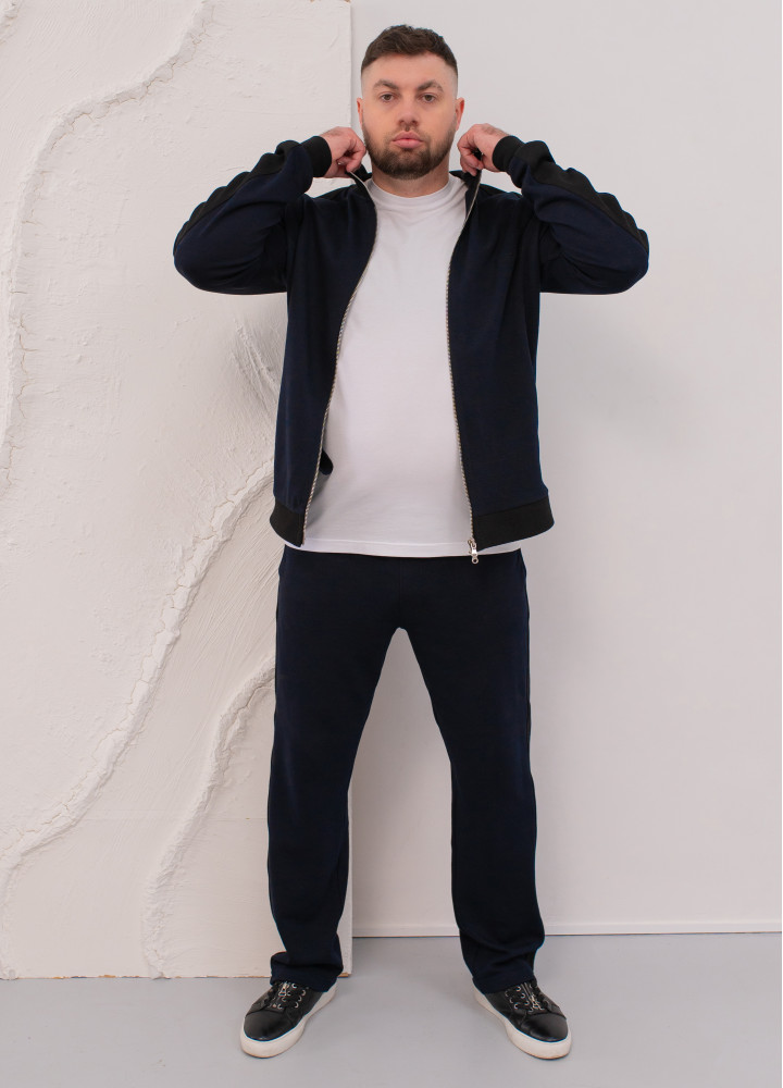 До костюма можна підібрати футболку в чорному кольорі, виготовлену з фактурної тканини, ідентичної матеріалу лампасів та манжет. Це створить ідеальний гармонійний ансамбль.