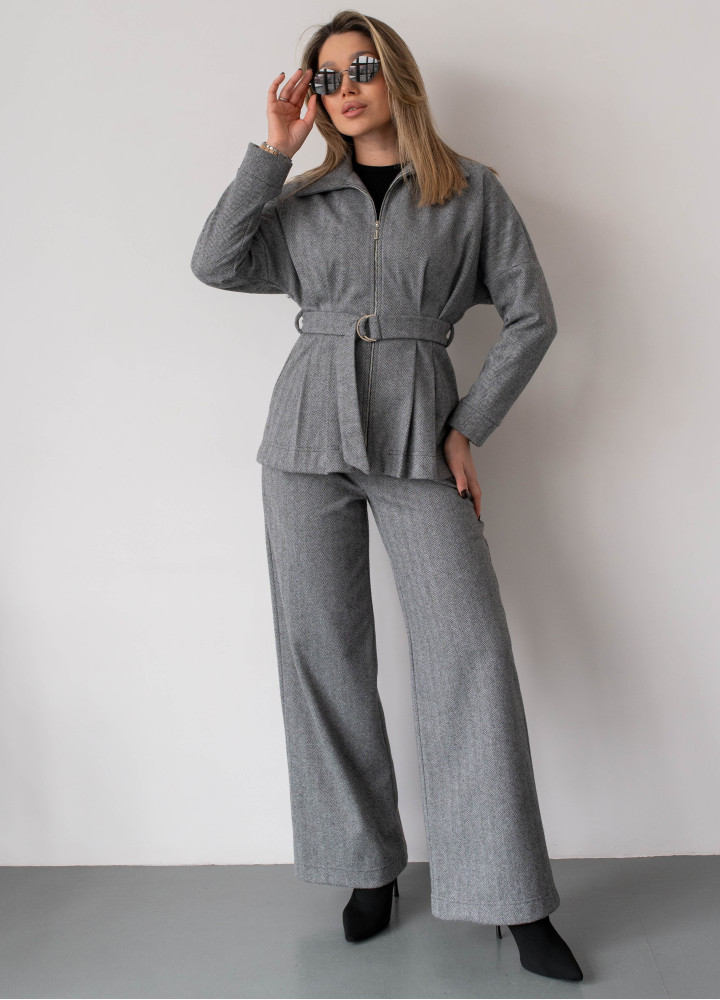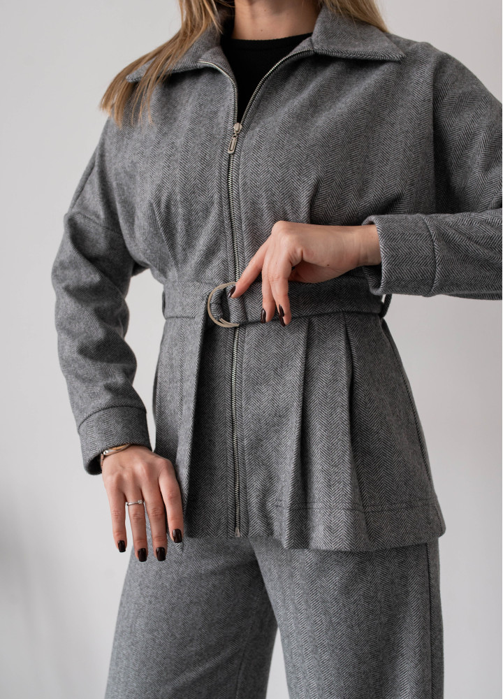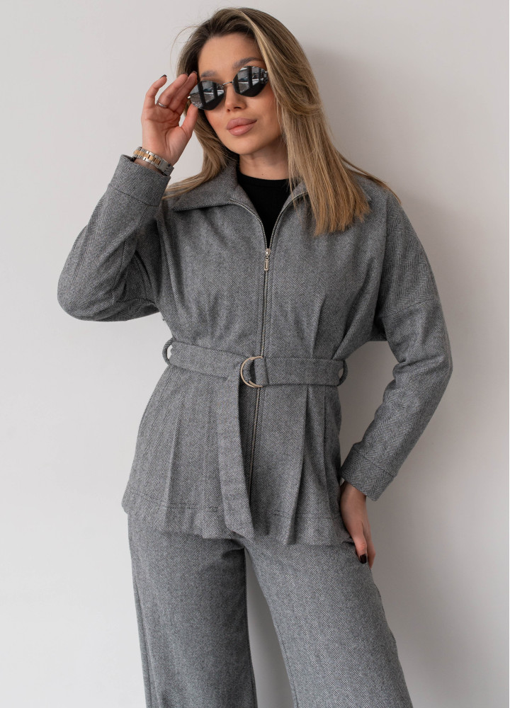 Верх: Жакет вільного крою на блискавці з коміром-стійкою. Знімний пояс із пряжкою акцентує талію, створюючи витончений силует.