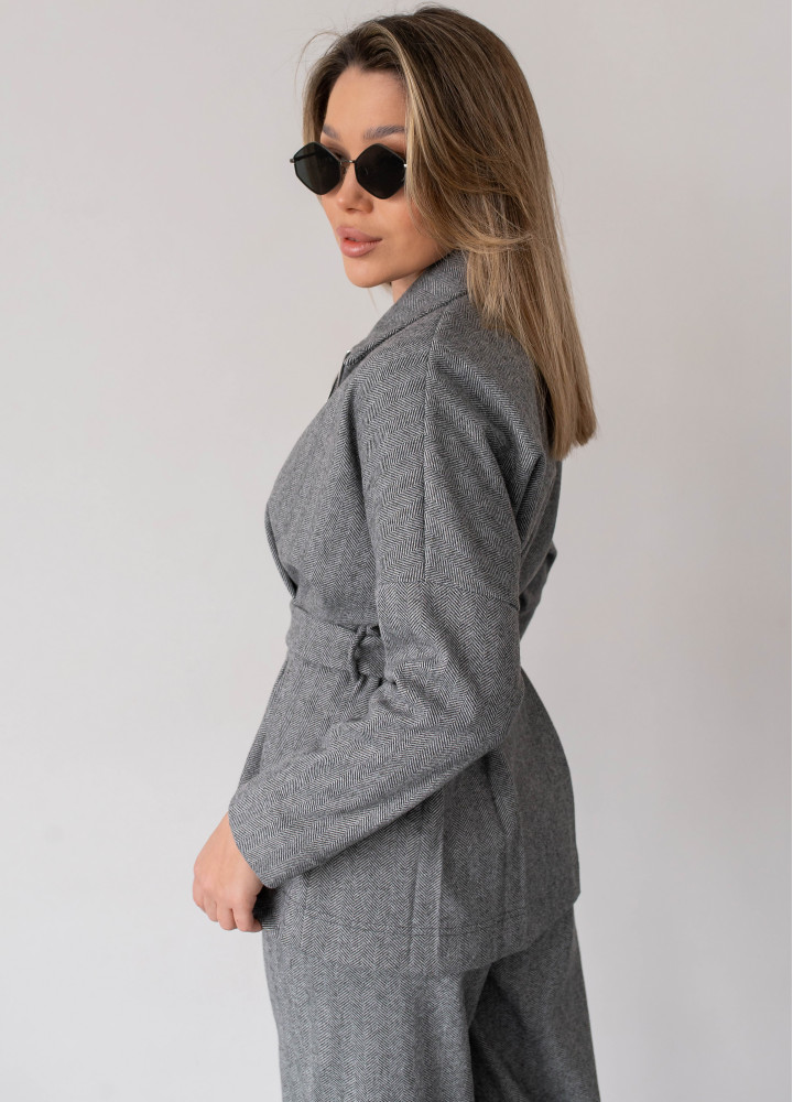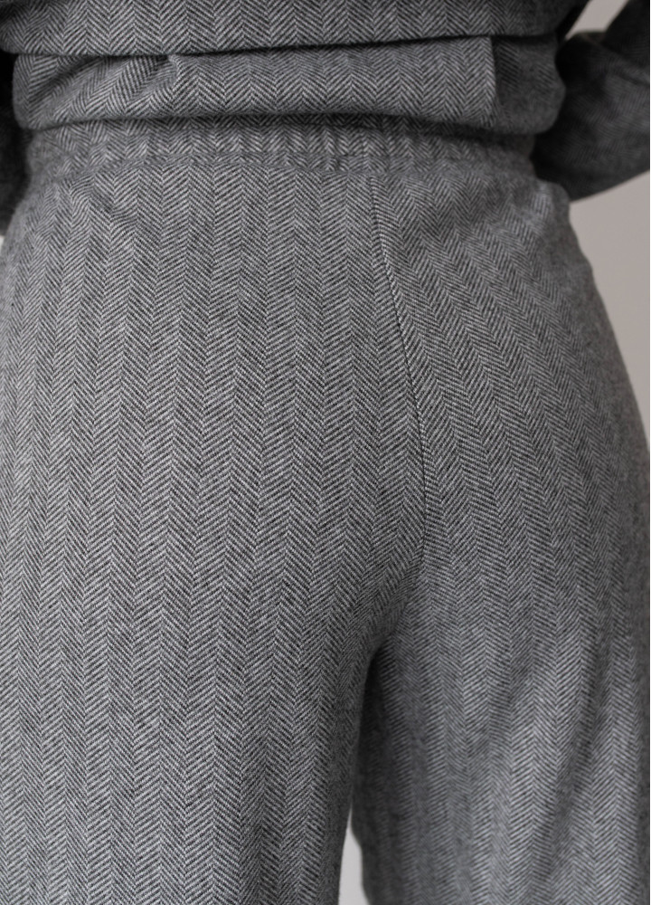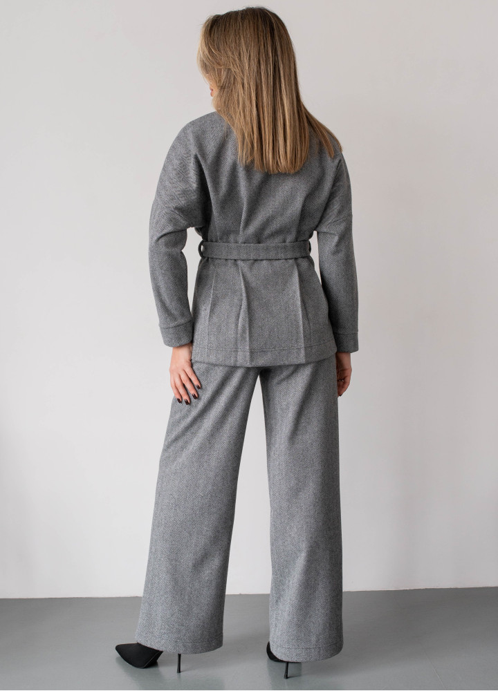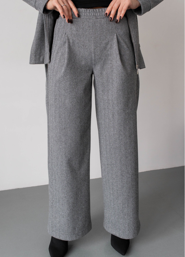 Цей сірий комплект у дрібну «ялинку» — втілення затишної класики. Склад із вовни (30%) та віскози (70%) робить тканину м’якою, приємною до тіла та водночас достатньо теплою для демісезону.
