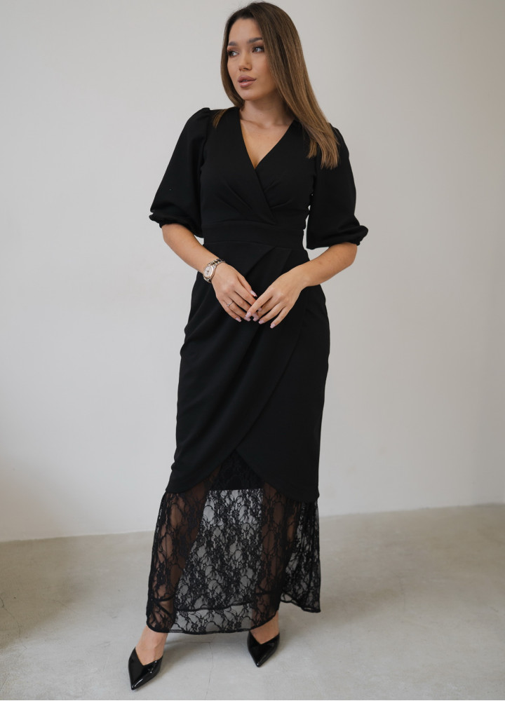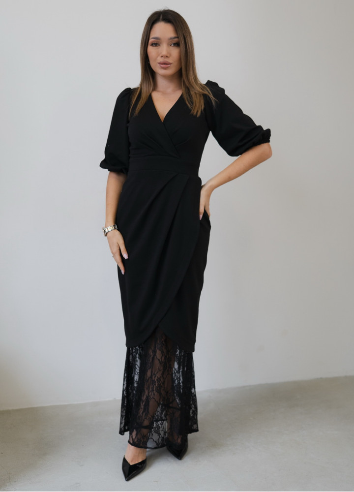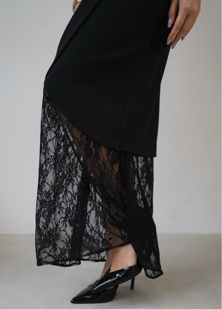 Мереживний під'юбник-спідниця, що виступає з-під чорної сукні, виконаний з гіпюру чорного кольору.
