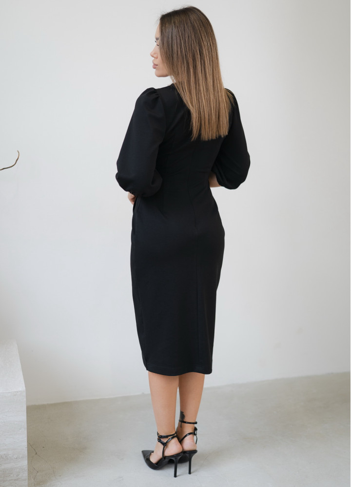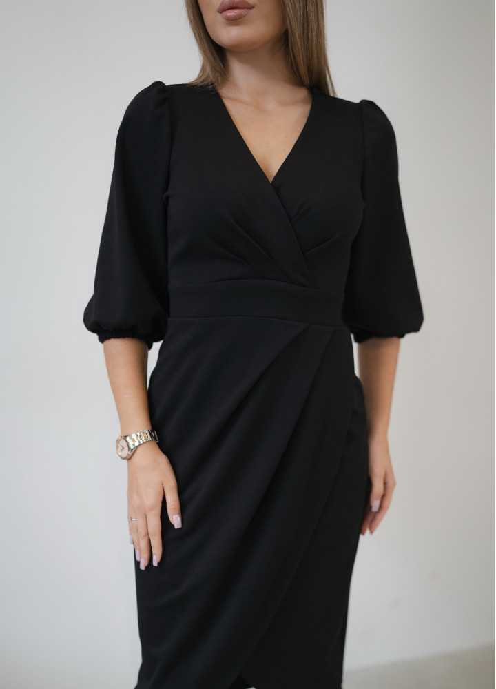 Чорна сукня-міді на запах з тканини алекс ідеально сідає по фігурі, підкреслюючи талію.