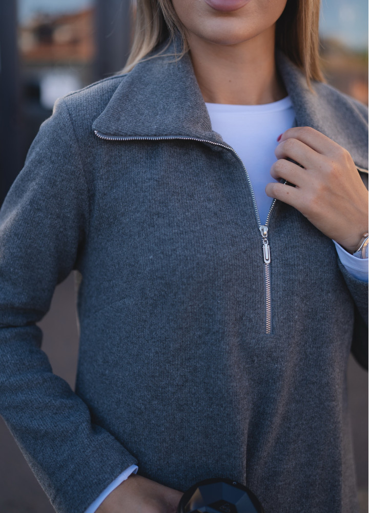 • Свитшот имеет высокий воротник-стойку на серебристой молнии (зипере), что позволяет регулировать глубину выреза. Плотная вязка по вороту и манжетам подчеркивает спортивно-элегантный стиль.