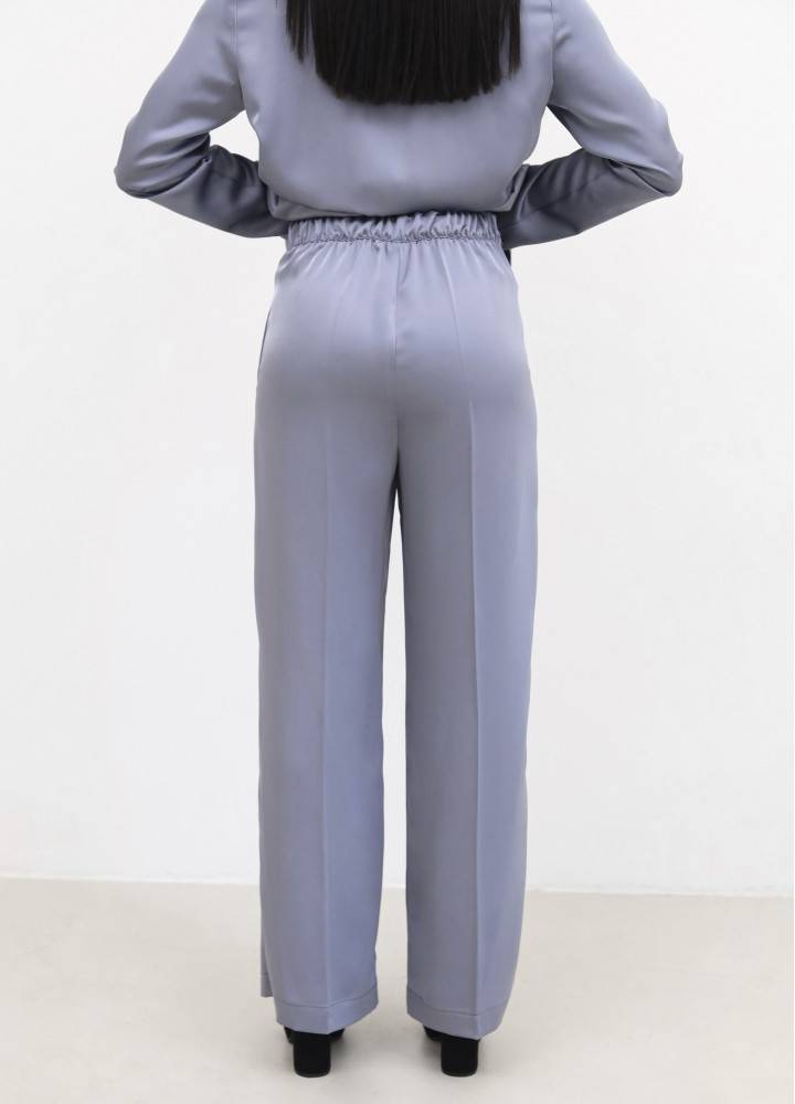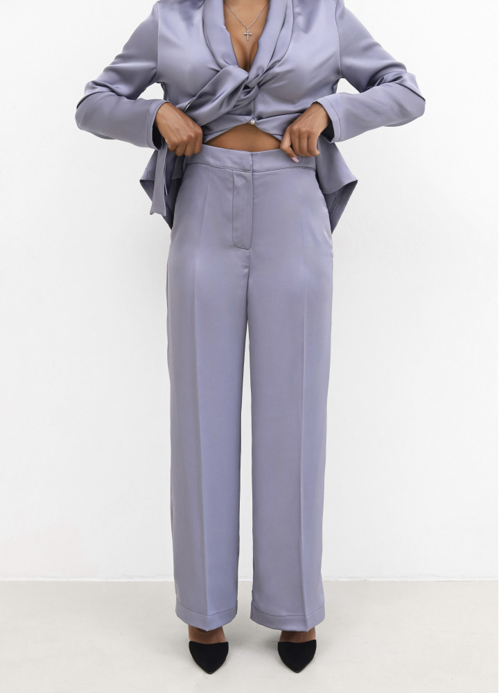 Элегантный брючный костюм из гладкого сатина в нежном серо-голубом цвете.