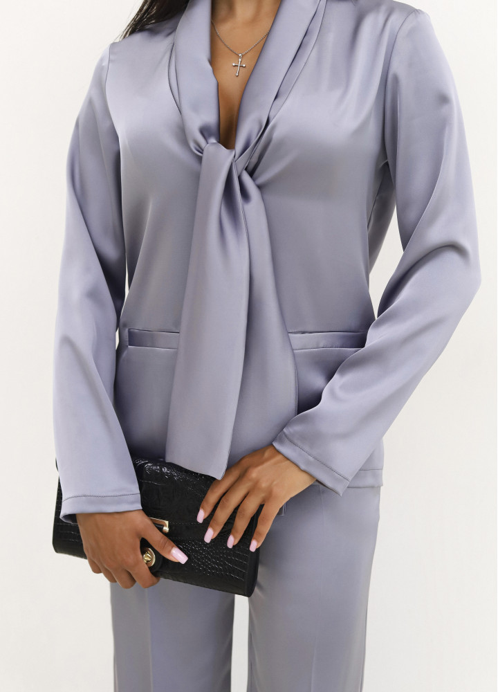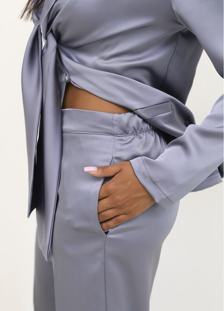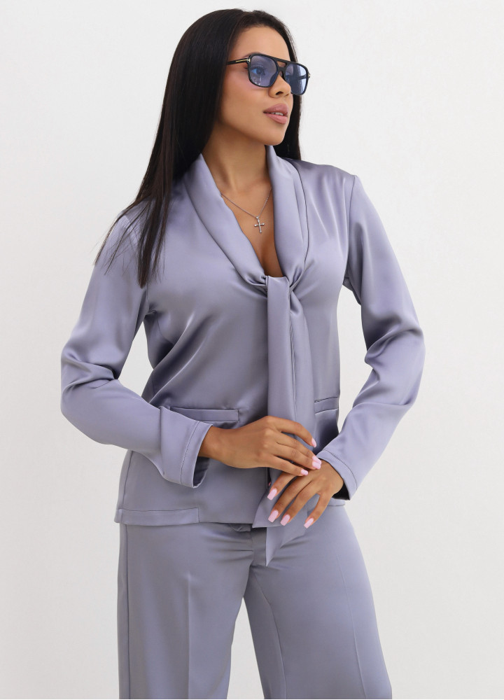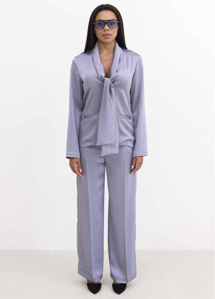 Брючный костюм с галстуком-лентой шелк сатин серый