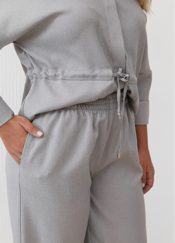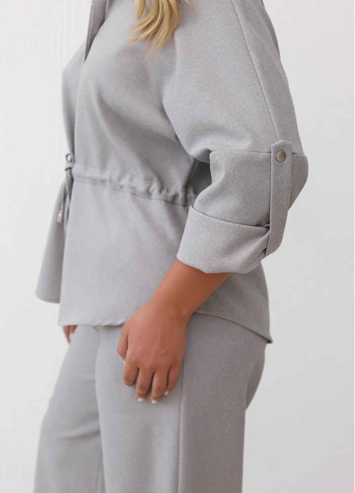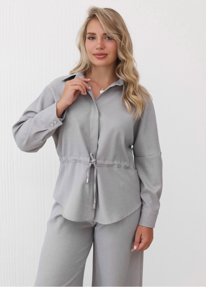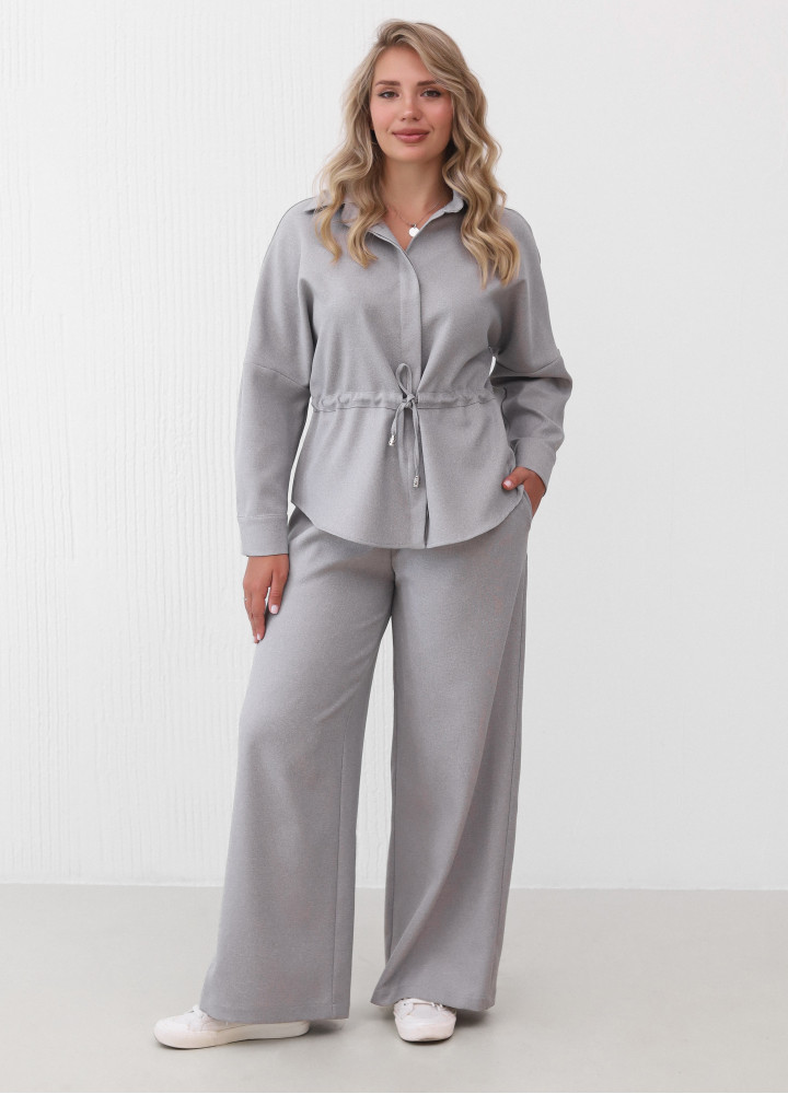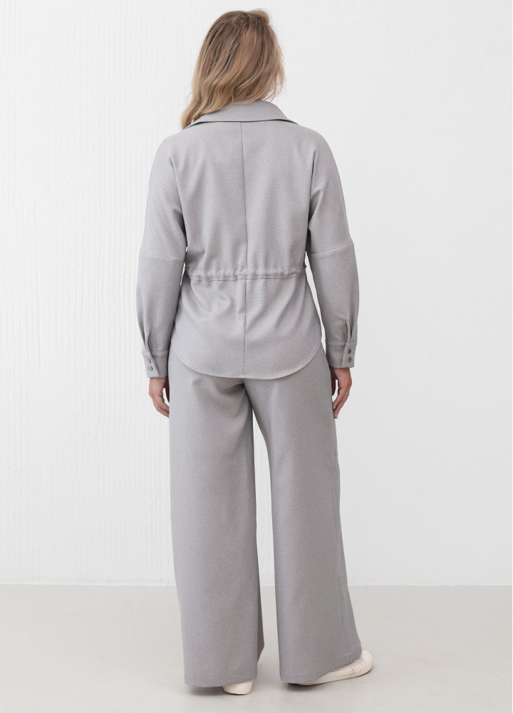 Комплект состоит из рубашки свободного кроя с отложным воротником и длинными рукавами.