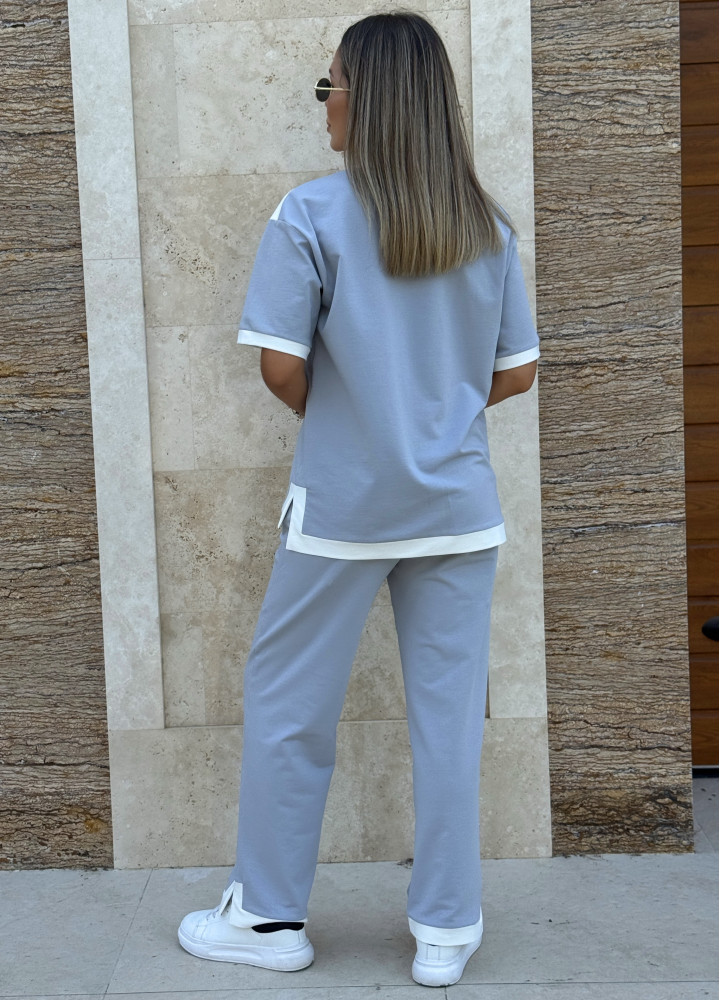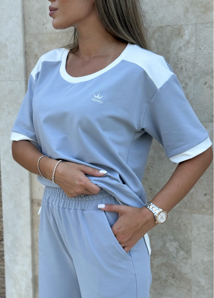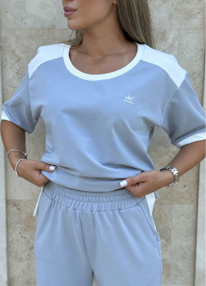 Стильный и комфортный спортивный костюм в нежном голубом с белыми контрастными элементами.