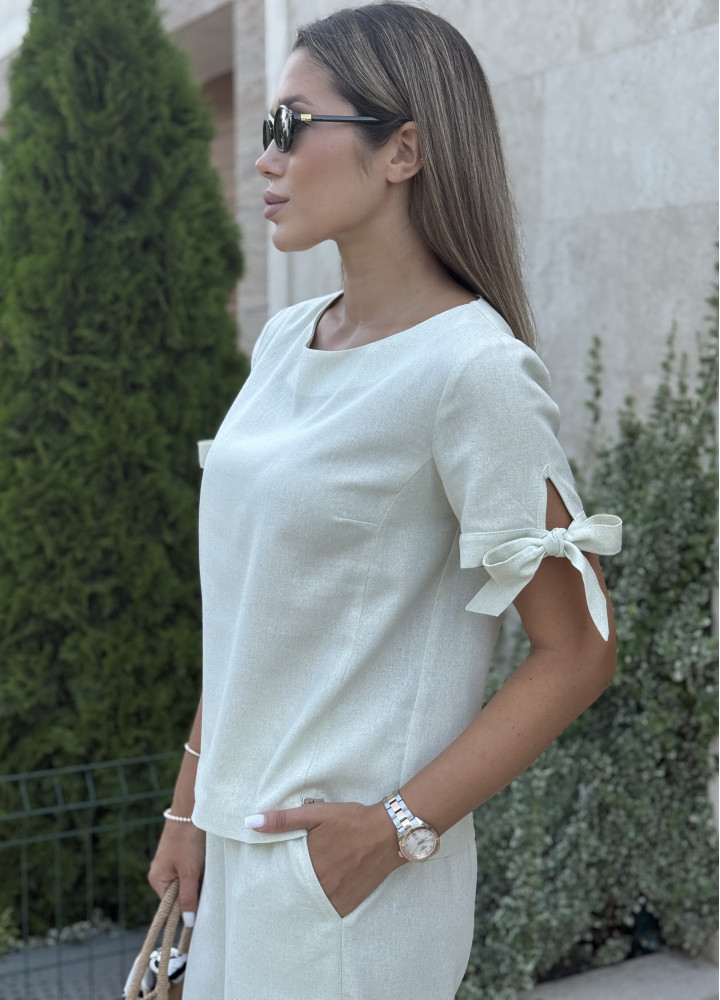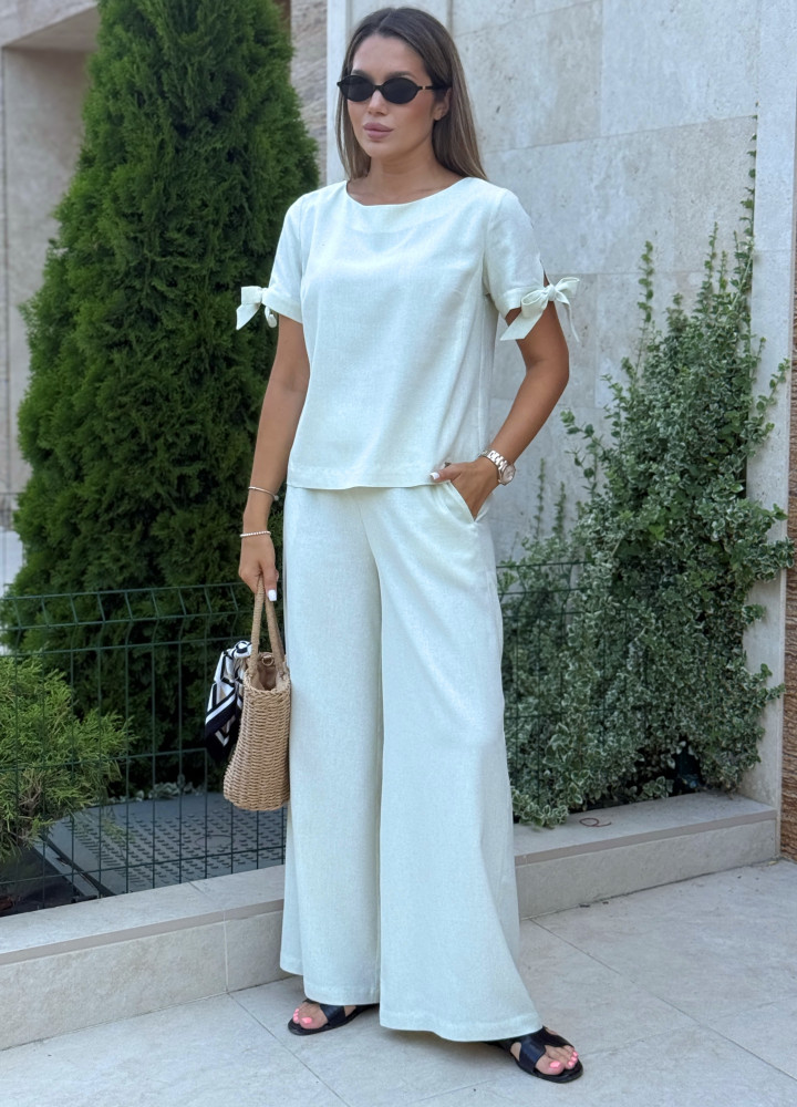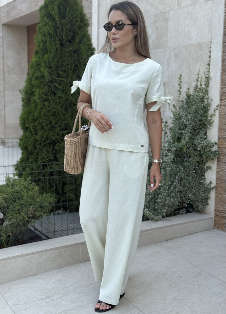 Костюм на літо виконаний з текстурованого легкого льону. Топ з напівкруглою горловиною має вільний крій та рукава на зав'язках. Трендові брюки палаццо з карманами по боках та еластичною вставкою у поясі.