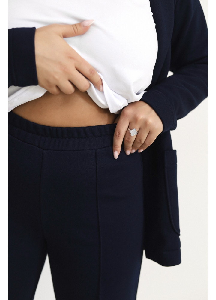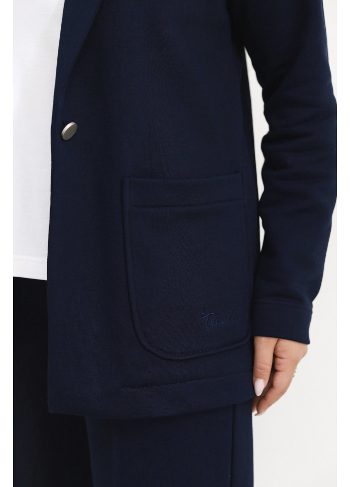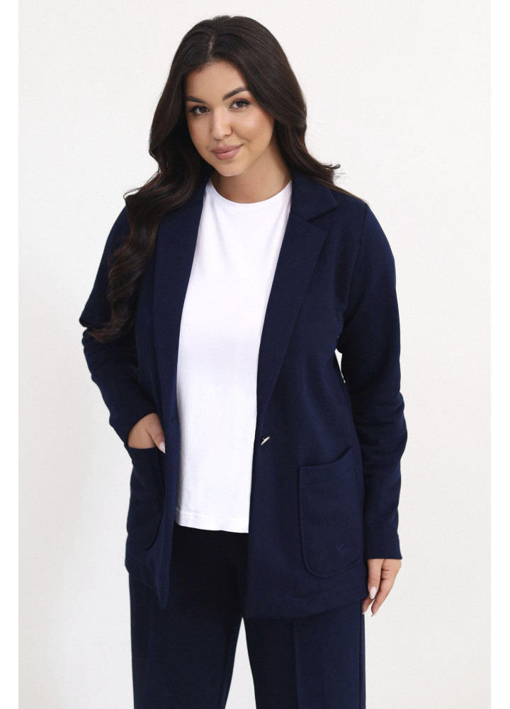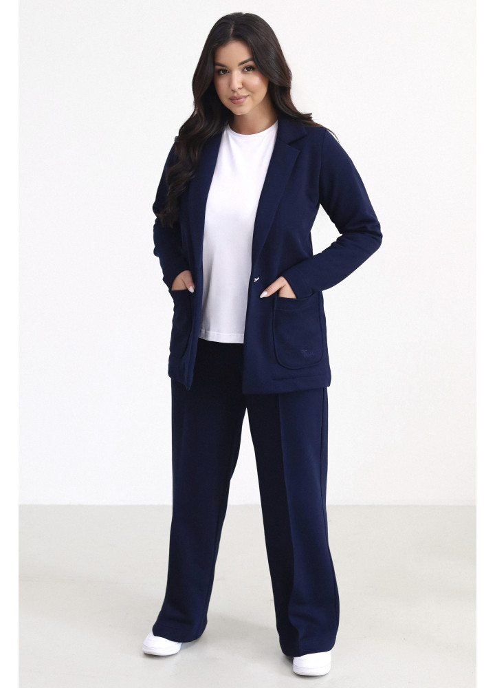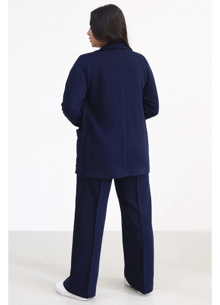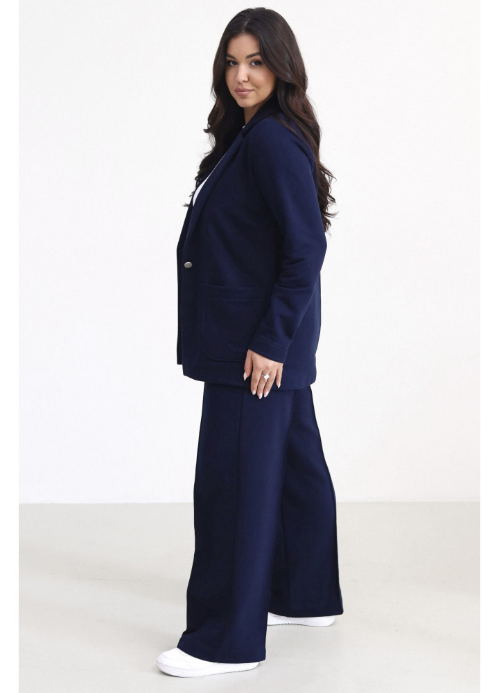 Костюм стильного трендового відтінку виконаний із трьохнитки. Модель складається з жакета oversize на гудзику та штанів з еластичною вставкою у поясі. Штани внизу та рукави жакета прибрані на резинки. Це ідеальний костюм для створення розслабленого образу з кедами або в стилі спорт-шик, якщо ви доповните його туфлями на шпильках.
